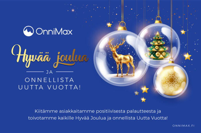 Kiitämme asiakkaitamme positiivisesta palautteesta ja toivotamme kaikille Hyvää Joulua ja onnellista Uutta Vuotta! Toivotamme hyvää juhla-aikaa! Tuokoon Uusi Vuosi iloa ja mukavuutta koteihinne, ja lisäksi onnistumista yrityksiin. Olkoon Uusi Vuosi iloinen ja hedelmällinen.